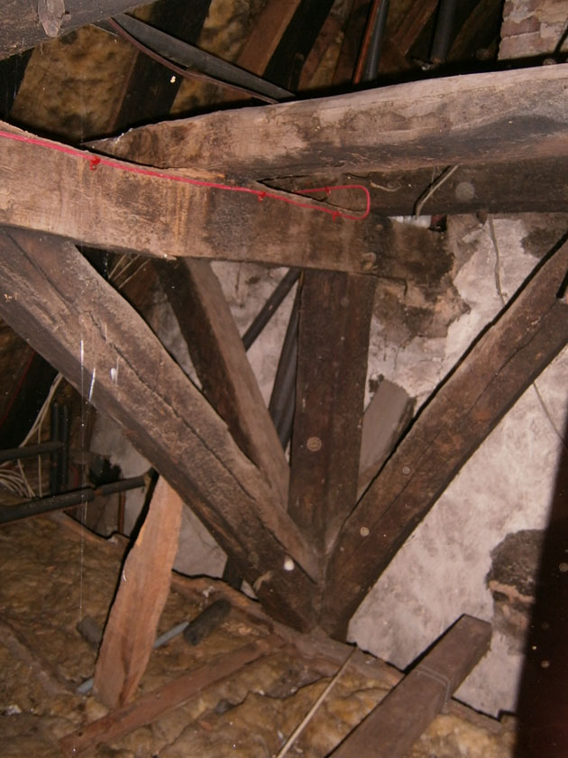 Tucked away above an inserted ceiling, the remains of part of a crown post roof dating to at least 1300 were observed. The four-way braced crown post survives above the later first floor ceiling and is significant in terms of construction, comprising an early and rare bare-faced lap joint between the two truss braces and the collar
